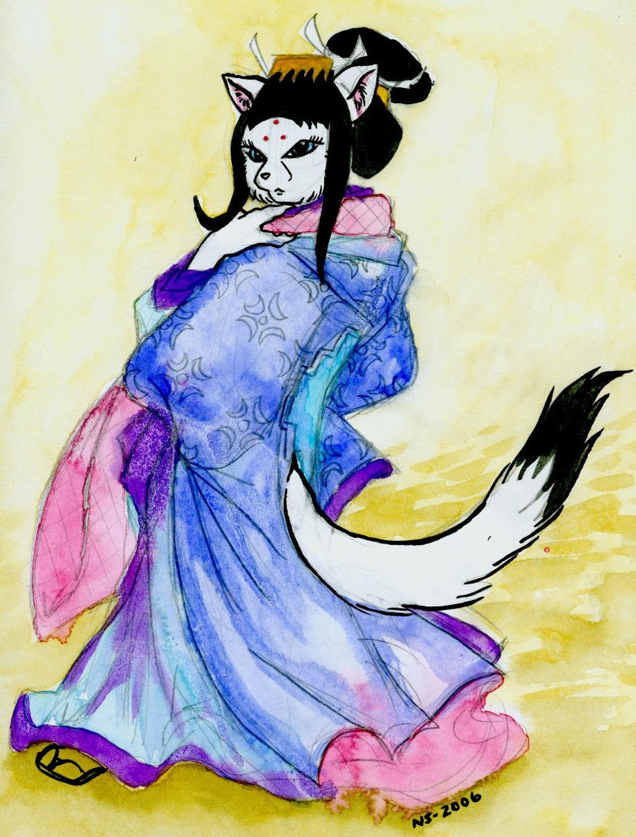 Color study of Cat-Girl Geisha in Watercolor