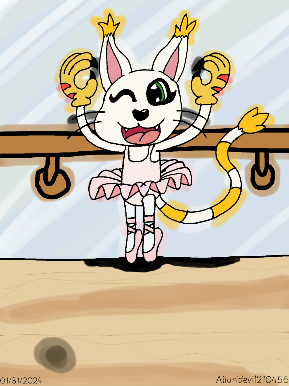 A gift for JamesG JamesG of his Digimon character, Jenny Greenwater the Renagatomon (Gatomon/Renamon hybrid, though morphologically mostly a Gatomon aside from the color highlights and the pattern on her belly that is not visible under her tutu.) wearing her ballerina tutu and dancing ballet.