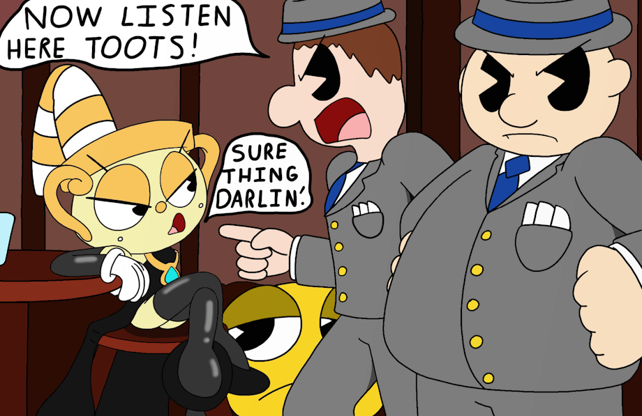 Ms. Chalice owns her own theater and host a wide variety of unique and kid-friendly shows towards a large audience with different preferences of what they like to see. Broadway shows full of entertainment, singing and comedy, expertly performed by Chalice which brings in a lot of money and sponsors. The cup brothers often can catch shows from her as well. However though, the world is cruel. Success like this will bring in competitors that won't like this level of fame, sometimes even having them send over a few thugs to have a "chat" with the accomplished. This often leads to bullying, harrassment, making bad deals, threats, finding loopholes, exploitation or even sometimes, straight up hurting or removing (kidnapping or murder) the competition by force and the like. A few sharp dressed thugs wearing fedoras accompanied by Coin Man, a cartoony coin being were sent down to "chat" with Chalice about her bringing in more people to her theater than to the one the thugs boss runs. Chalice has one competitor that is the only one below her that runs an underground theater full of wise guys and fedora-wearing thugs because the 1930s be like that.