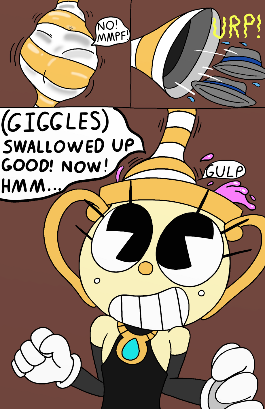 Then with a powerful gulp she swallowed them both whole down into her stomach. She gave Coin Man a message to deliver to the crime boss who sent the thugs to her to tell him that she won't kill or digest them, but she won't be returning them for the remainder of the nigh as she has plans for them. Scared by this Coin Man listened and delivered her message to the crime boss.