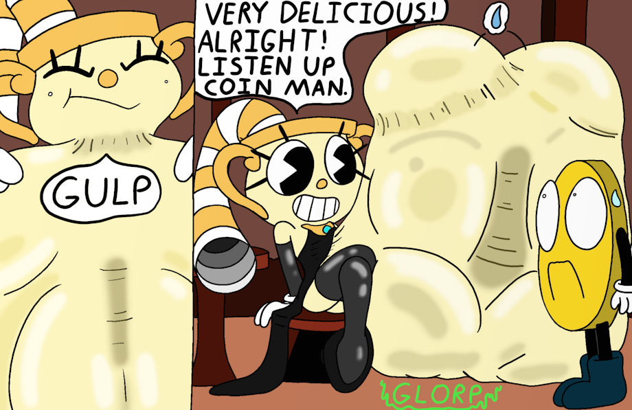 Then with a powerful gulp she swallowed them both whole down into her stomach. She gave Coin Man a message to deliver to the crime boss who sent the thugs to her to tell him that she won't kill or digest them, but she won't be returning them for the remainder of the nigh as she has plans for them. Scared by this Coin Man listened and delivered her message to the crime boss.