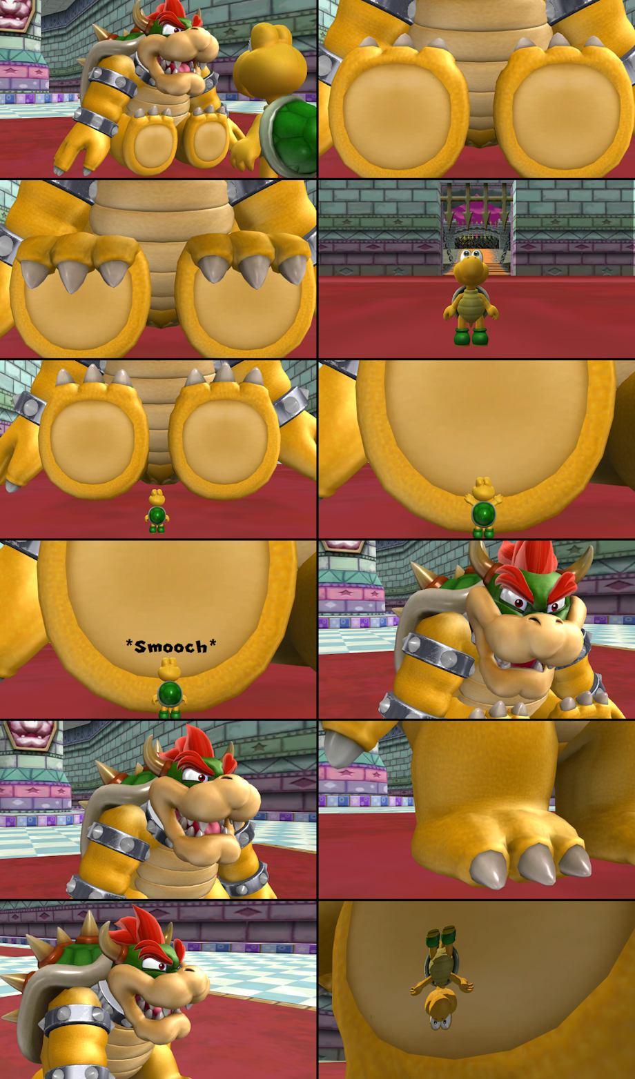 suggested me to do a comic of Bowser feet teasing a Koopa Troopa, so here it is. -- Bowser here is feet teasing the Koopa Troopa with his feet as he shrinks the Koopa Troopa by moving his toes forward and backwards/back and forth. Then the latter goes over to his feet and rubs/kisses his right foot while Bowser smiles happily. After that, Bowser got up and accidentally stomped the shrunken Koopa Troopa while leaving and became flattened under his foot as a result. -- Super Mario(c) Nintendo Models(c) SAB64