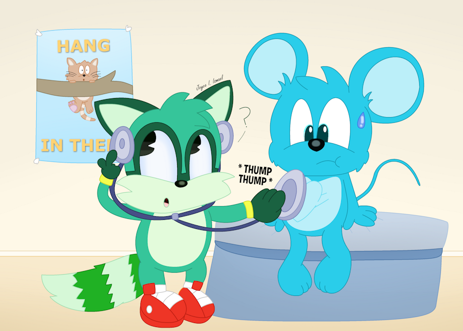 Point commission for PhazonWarrior850 on DeviantArt, who wanted their OCs Orion the cat-raccoon hybrid using a stethoscope on Steven the mouse. By the looks of things, Steven's got a massive heartbeat. The lollipop better be worth it at the end. 😁