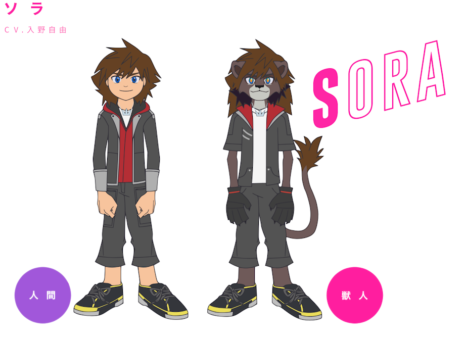Sora is a human Keyblade wielder who was turned into a Lion Beastman the same way as Michiru and Nazuna except he was trying to destroy Doofenshmirtz's Ultima-Other-Dimension-ator, but was hurt and his blood was lost during the incident. He has the same transformation powers as Michiru, such as gorilla arms, cheetah speed and wings.
