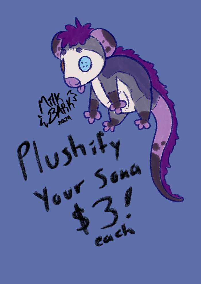 3 dollars each, can do any species, can make it nsfw. Send me a message here or on Twitter or discord (@M1lkb4rk for both) to claim a spot! Unlimited spots available!