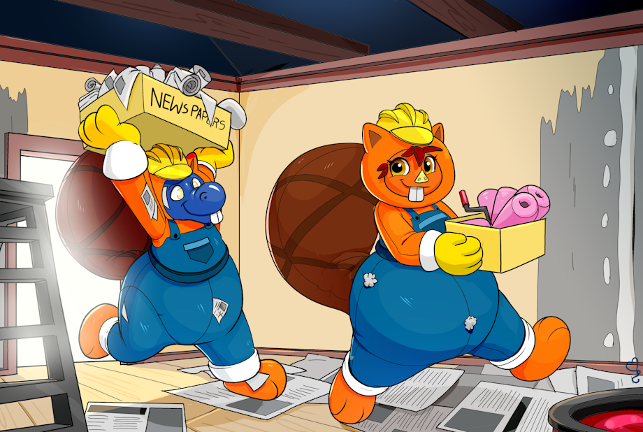 2 plushie handy beavers, BouchDaBat and GuardianDrake, being cute hard working puffy balls
