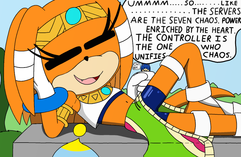 Tikal relaxed herself on a stone slab and made Sonic listen to the ancient saying about the Seven Chaos Emeralds while she had him handheld. Something he wasn't expecting at all since he's normally sent to her at normal size. He's stuck there until she's done talking and her red light returns him to the present.