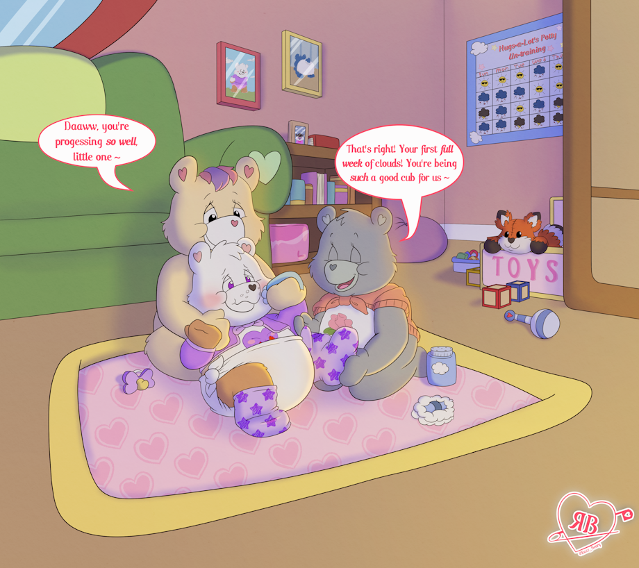 When Snow got offered the chance to join the Care Bear Family and became a Care Bear himself, he hadn't expected this to be the way it went. True Heart and Grams said he had a natural aptitude for the job, he'd expected to be going on caring missions within the month! Instead, as soon as they arrived in Care-a-Lot, the two older bears had swiftly diapered the Pizzly, and dressed him just like an adorable Care Bear Cub, officially dubbing him as baby Hugs-a-Lot.