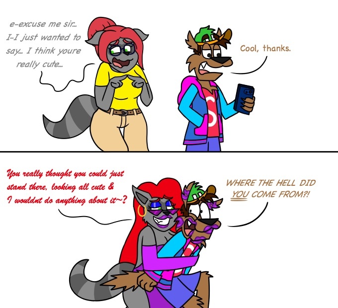 The nerdy raccoon cutie Natalie is back and showing off her usual antics. Like I mentioned before, when Natalie gets too turned on, she loses control and turns into Natalia. A perfect example is presented here when she meets the werewolf delivery man Scotty. The shy little ringtail tried to chat with him, but the sound of his voice was apparently a major turn on to her.