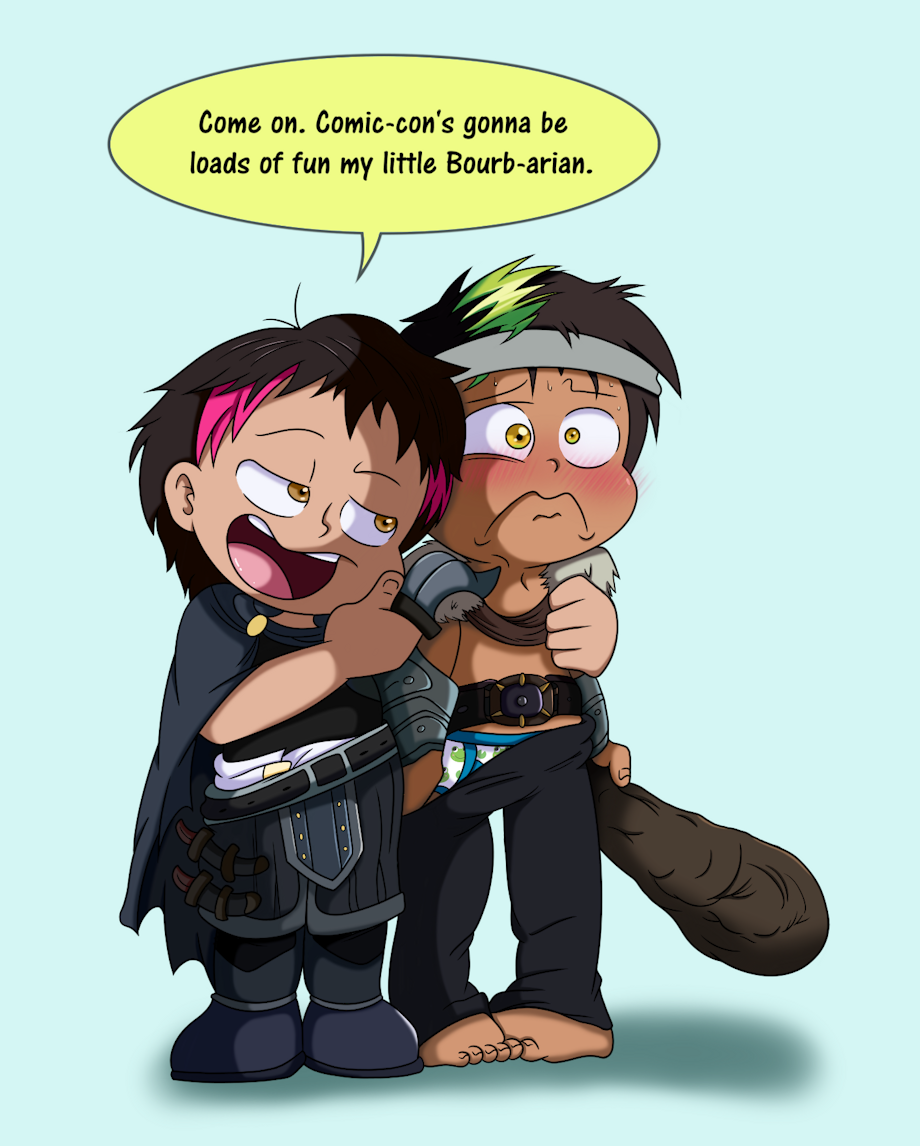 Tamia won another bet against Bourbon and got him to agree to come with him to a Comic-Con dressed up as Dnd Characters with Tamia picking the costumes. Tamia picked a confident rogue character and has a smirk on his face, with his right arm wrapped around Bourbon's shoulders, playfully holding a fake dagger against Bourbon's neck with his left hand. Bourbon is very embarrassed, and dressed up as a Barbarian (a Bourb-arian as Tamia keeps pointing out).