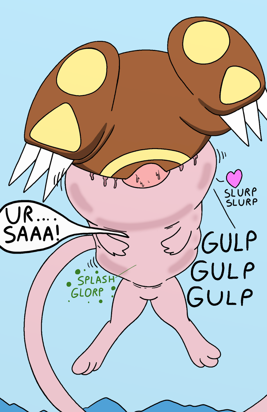 Just like that, Mew easily swallowed down an entire Pokemon over twice it's size without shrinking him first. The Ursaring was sitting there inside of Mew's stomach scared and confused as to how a Mew smaller than him was able to do this.