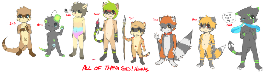 Ferret: SOLD to @buckleypuppy OtterMoogle: SOLD to @buckleypuppy CandySheep: SOLD to @MightBeFurry PainterlyCat!: SOLD to @Scheknul TribalSaberCat!:SOLD to
