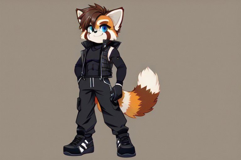 Prompt: Male Red Panda, Ribbed abs, Ember eyes, Brown Hair, Blue eyes, techwear, Black Vest, Black T-Shirt, Grey Pants, shoes