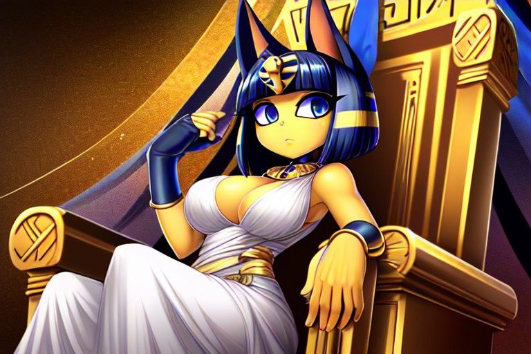 Prompt: Ankha, busty, skinny, tall, cleavage, ribbed abs, White Dress, sleeveless, Throne.
