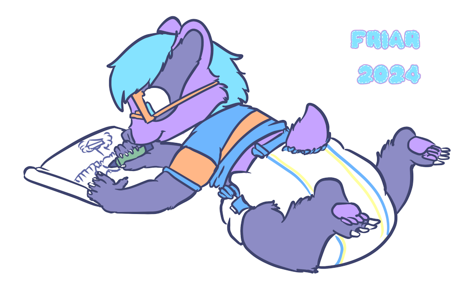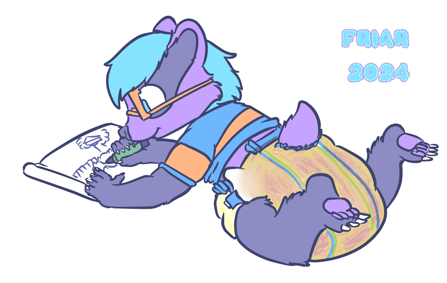 Illustration of Everett the wet and messy diapered badger drawing in a sketchbook with a crayon in the treehouse, a lantern illuminating the room.