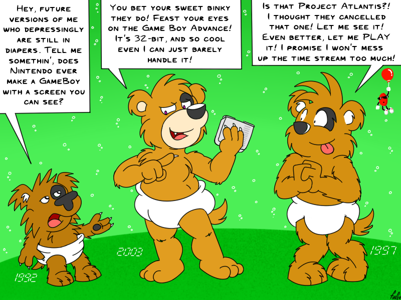 Here's part of the Time Rift mini-saga that I never posted here... three Byrons discuss the Game Boy Advance, along with its unreleased predecessor, "Project Atlantis." Evidently the Game Boy Advance was conceptualized in 1998, but the technology was so far ahead of its time that they put it on the backburner and settled for the decidedly less exciting Game Boy Color.