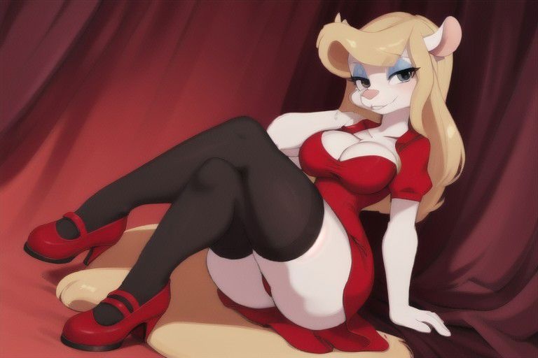 Prompt: Minerva Mink, busty, cleavage, Red Dress, short sleeves, Black stockings, shoes.