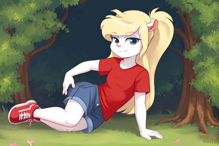 Prompt: Female Mink, Solo, Young Child, yellow hair, white fur, Red T-Shirt, Blue Jean shorts, shoes