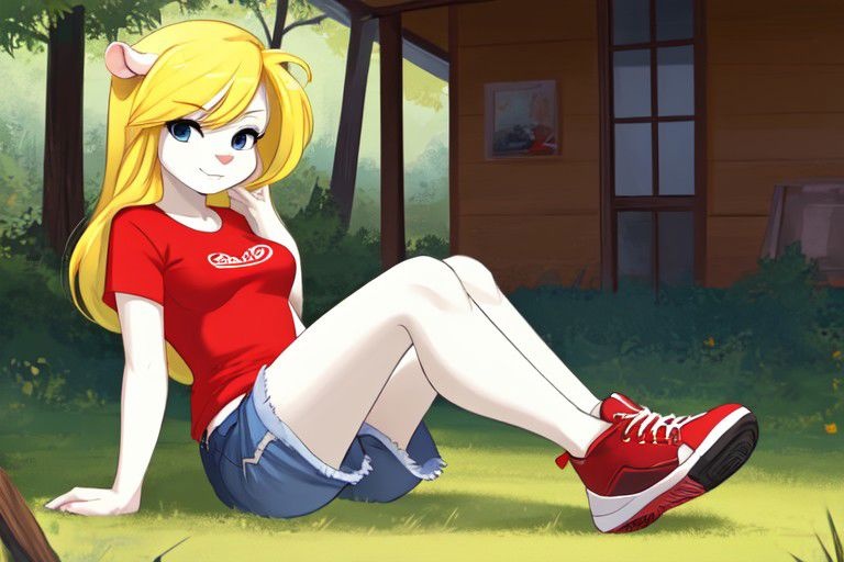 Prompt: Female Mink, Solo, Young Child, yellow hair, white fur, Red T-Shirt, Blue Jean shorts, shoes