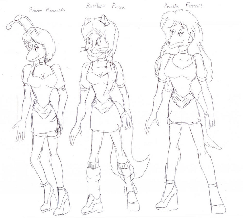 Here are sketches of the Wait Staff of Phoebe Burger's Restaurant. Sharon Formica is an Ant, and two of my old OCs Rainbow now called Rainbow Prism and Icfire now called Pamela Furnis. This is just a little picture while I work out details.