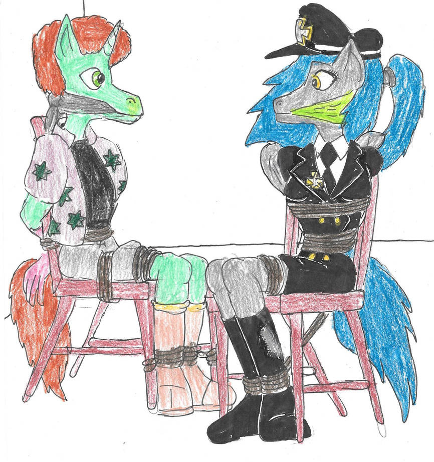 This is a request by :iconspyaroundhere35: for two My Little Pony fan original characters being captured. We have Andrew Linkforce the unicorn and Blitz the German Preartorian Pegasus in a classic chair tie. One of them was on the way to rescue the other, it has not gone the way that they planed.