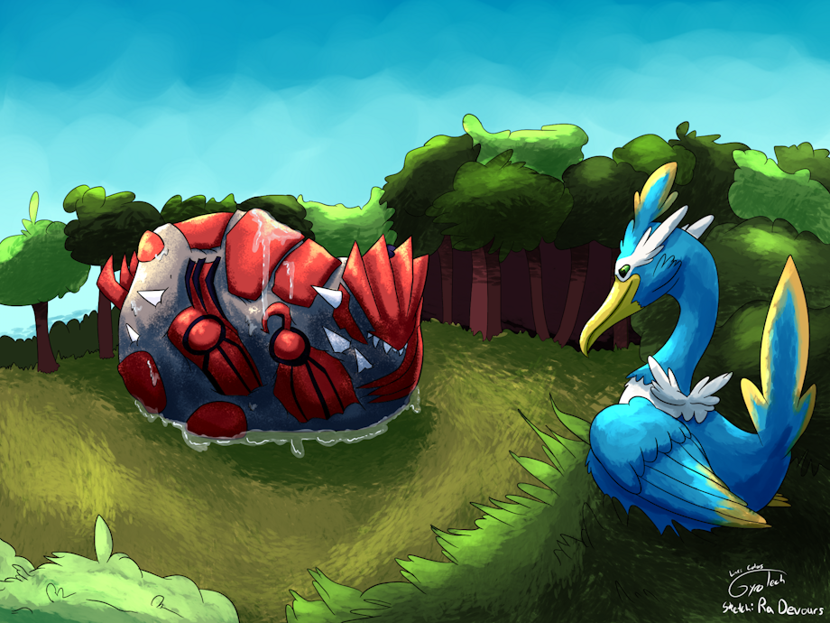 Thunk somehow got his beak around a Groudon. Poor legendary is helpless against the bird~