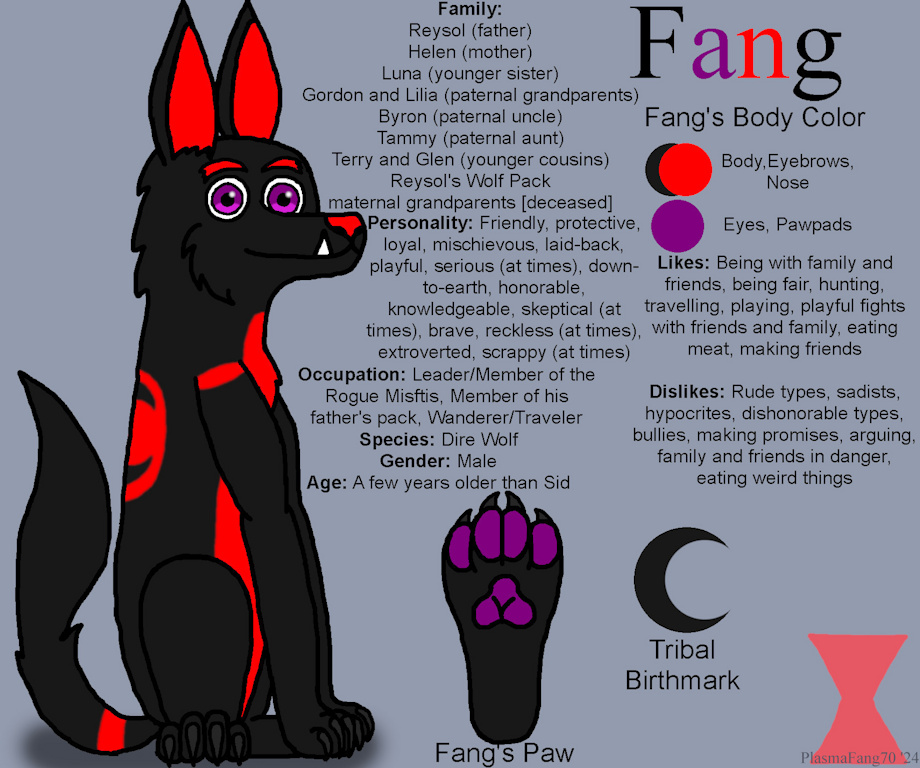 Fang is muscular and healthy, just like Diego. He has fangs pointing upwards from the bottom of his mouth. He has red and black fur, red nose, purple eyes and purple paw pads. Furthermore, he also has a black moon mark on his back.