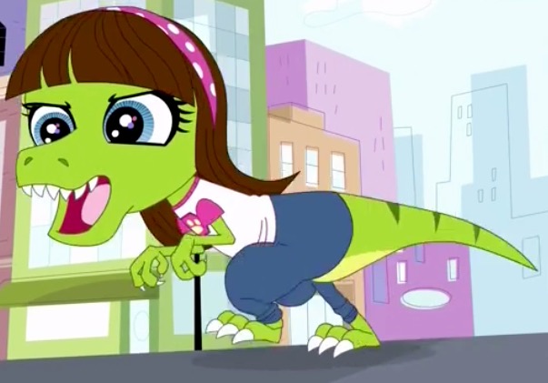 In one episode of Littlest Pet Shop 2012, Vinnie and Sunvil imagined that Blythe Baxter was really a dinosaur rampaging through the city. T-Rex Blythe or Blythesaurus Rex was way too cute not to include. Some fearless dinosaur hunters or maybe it was Sunvil and Vinnie has captured the fearsome T-Rex Blythe