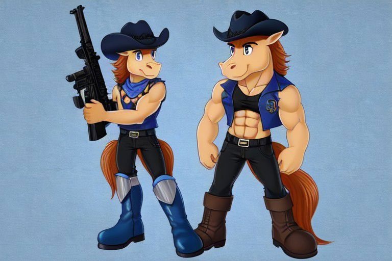 Prompt: Male Horse, Ribbed abs, blue cowboy Hat, Blue army Vest, Black T-Shirt, Black Pants, Boots, Shin Guards, Blue Bandana, Rifle