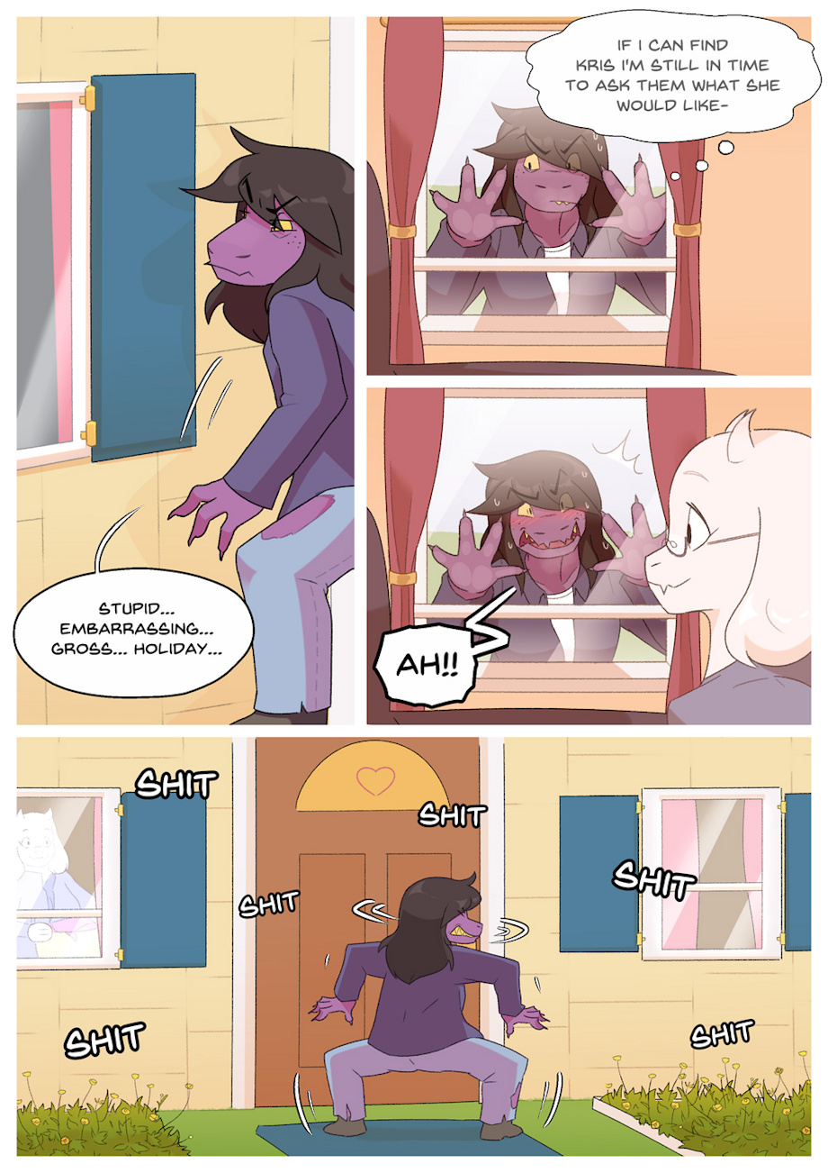 i loved the idea of susie having a crush on toriel since deltarune came out, and the end of chapter 2 only solidified that for me <3 i know it's not a hugely popular ship, and this is just a little cutesy sfw comic, but i've been meaning to make something for this ship for a long while!