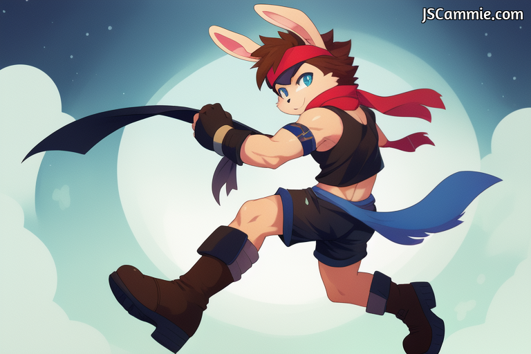 Prompt: Male Rabbit, ribbed abs, Blue fur, White belly, Short hair, Brown hair, Ninja outfit, Black tank top, shorts, headband, armbands, scarf, boots, shin guards