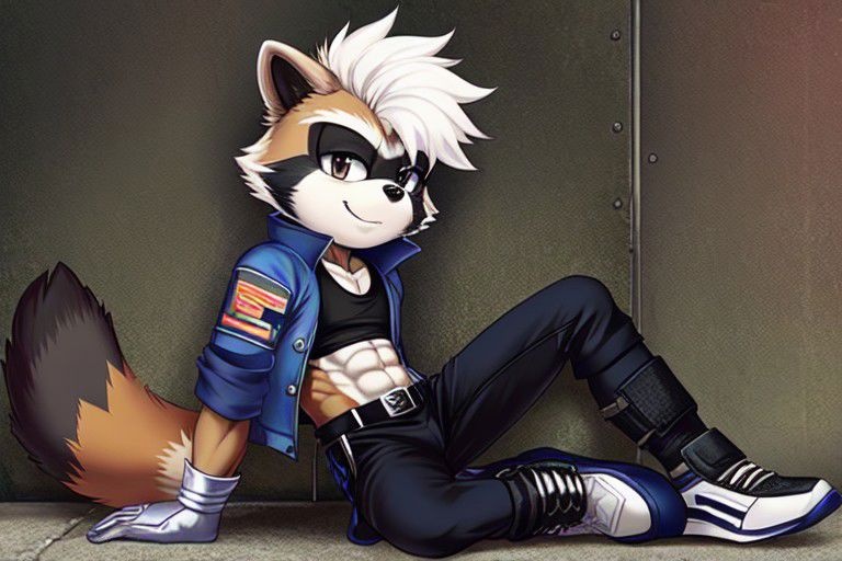 Prompt: Male Raccoon, ribbed abs, grey fur, Black Belly, short Hair, white hair, Navy Blue jacket, Black tank top, short sleeves, Black pants, shoes, shin guards