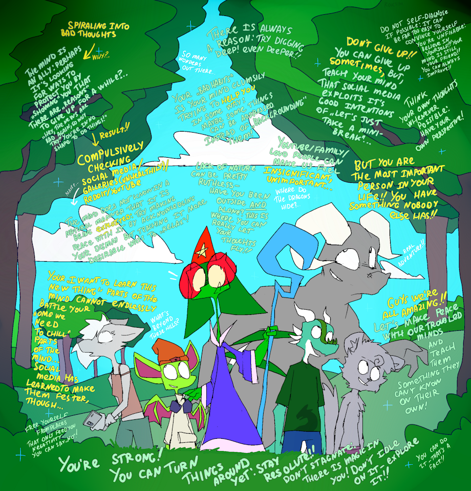 Hey folks! This is the result of my Art Event all about bad habits - thank you to those who participated!! I have attempted to address some of our mutual concerns and bad habits with this piece rather directly... I hope it does not read as "preachy" - as you know, I myself am struggling with bad habits too, so, this is as much for me as it is for you! Folks, we are incredible - our brains are NOT broken, and we are NOT unfixable, and don't let anyone try to convince you that you are! I see so many people just going like "Oh I just have ADHD so I am a lost cause", and I just feel like the common symptoms of it are so similar to the state of mind where you're posioned by social media, that you can never truly be sure unless you've been diagnosed 5 times over by specialists - which is why I included the bit about self-diagnosing! Guys, guys, guys, we can really do it, you know?? It's not too late!! Let this drawing be your sign - you CAN fix your life yet!!!! You CAN fix your brain!! Plead with it, make peace with parts of it that are confused and fooled by "easy solutions" - this doesn't just go for social media, this also goes for overeating, escaping into sleep whenever you can, browsing NSFW whenever possible, avoiding contact with new people... You're a hero!! Aren't you?? You're your own hero, yes!! I'm my own hero too - let's not let the moments of strength get unaddressed and waste them, and in these moments of strength, let's also recognize our weaknesses and try to find the root of them - that root might very well exist!! In fact, it definitely does exist - I believe we don't just do things because we're "used" to doing it, no, instead, we do things because there is a reason for it, including bad habits, and until you can untie that reason and shine a spotlight on it, I think you will struggle! I have attempted to lay out what I think is the reason for most common bad habits we share in the top left corner!