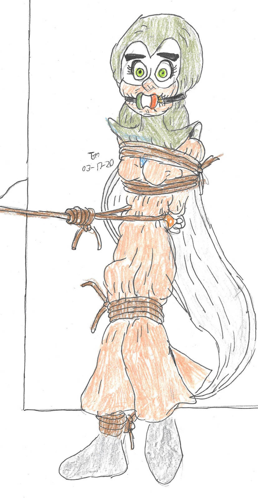 This is Aisling, the forest fairy, of the animated film The Secret of the Kells being kidnapped in a burqa. She is being taken way in a burka to some unknown fate.