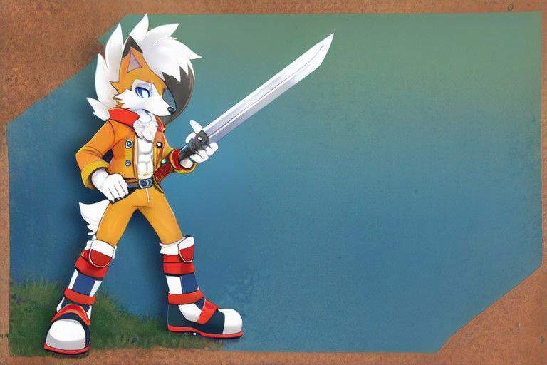 Prompt: Pokemon, male Dusk Lycanroc, Ribbed abs, Blue eyes, Orange Jacket, Blue Plants, Yellow scarf, white shoes, shin guards, two handed sword.