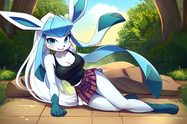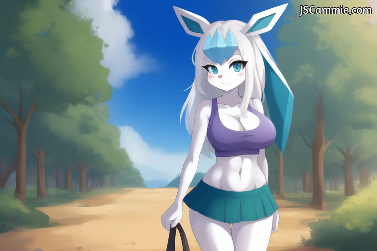 Prompt: Pokemon, Glaceon, female, Long White hair, busty, skinny, tall, cleavage, tank top, skirt