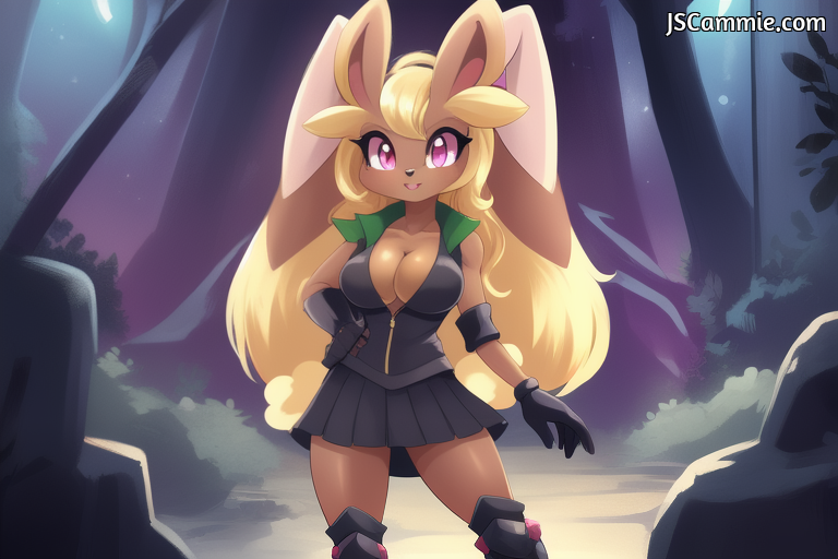 Prompt: Pokemon, Lopunny, Anthro, Furry, busty, skinny, tall, cleavage, Ribbed abs, Pink eyes, Long Hair, yellow Hair, Brown fur, Black Body Suit, Green Vest, Black Skirt, Black Boots, Shin Guards, Black Gloves, Green stockings.