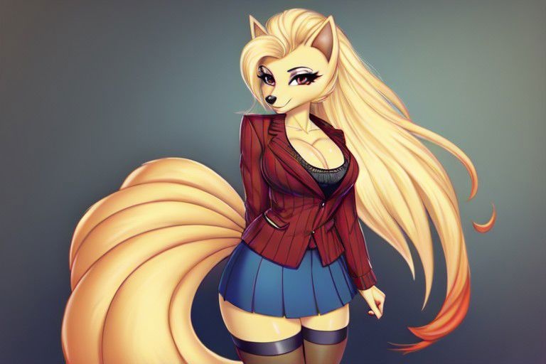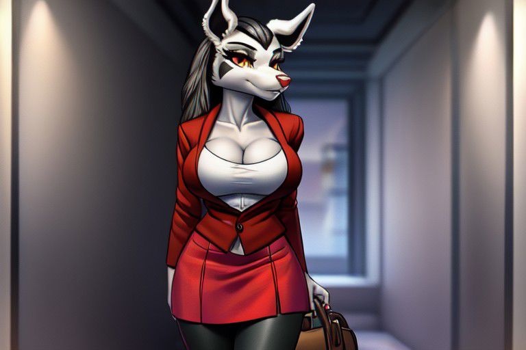 Prompt: Pokemon, Female Mightyena, ribbed abs, busty, skinny, tall, cleavage, Red Blazer, White blouse, red skirt, grey leggings