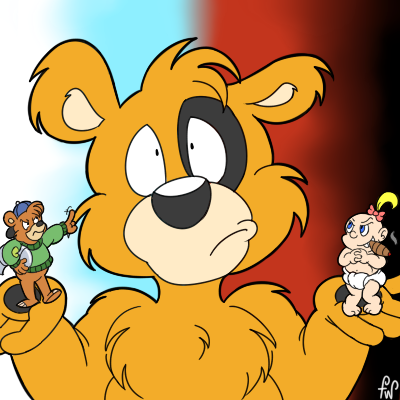 Byron is caught between his superego and id in this drawing, inspired in part by Reva the Scarf. That's Kit Cloudkicker on the left and Baby Herman on the right, for those curious. Good or evil, there's no escape from the Walt Disney Company!