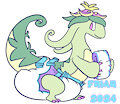 Illustration of a Dinossom, a leafy headed dragon in a wet and messy diaper, smiling and carrying a fresh diaper over by a wooden farm pen by a tree in front of a mountainous and coniferous tree setting.