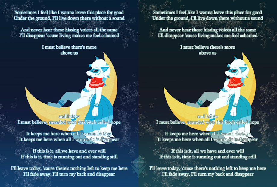 I've loved this song for a long time, finally ended up using it for art inspiration. [Song link] Was only going to upload one version to my galleries, but I wasn't sure which version looked better, so I thought, why not combine both into one image? I think each one has its own merits.