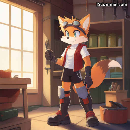 Prompt: Male Tails the fox, Ribbed abs techwear, red vest, red shorts, white T-Shirt, goggles on head, Red and White Boots, Shin Guards, workshop, Standing up.