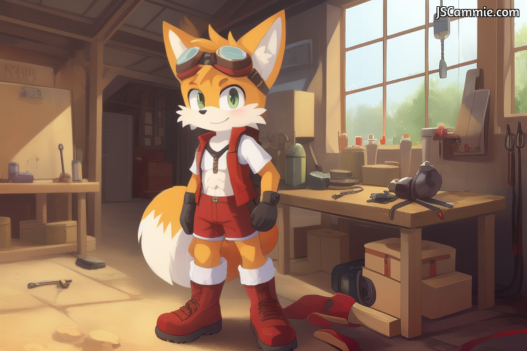 Prompt: Male Tails the fox, Ribbed abs techwear, red vest, red shorts, white T-Shirt, goggles on head, Red and White Boots, Shin Guards, workshop, Standing up.