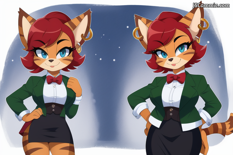 Prompt: Peg Pete, solo, Breed: Tabby Cat, Busty, red hair, blue eyes, tail, shirt, bow, jewelry, jacket, white shirt, earrings, bowtie, green skirt, black bow, formal, suit, green jacket, pencil skirt, hoop earrings, animal nose.
