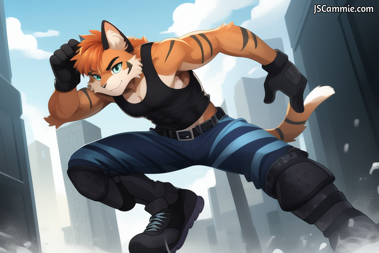 Prompt: Peg Pete, solo, Breed: Tabby Cat, Busty, red hair, Purple sweater tank top, sleeveless, white pants, hoop earrings, blue eyes, tail, animal nose, standing up.