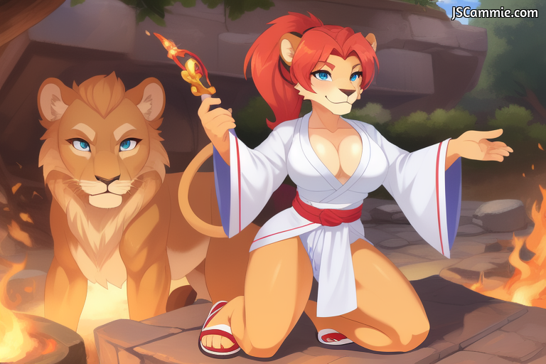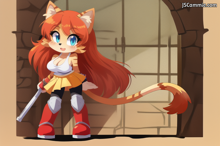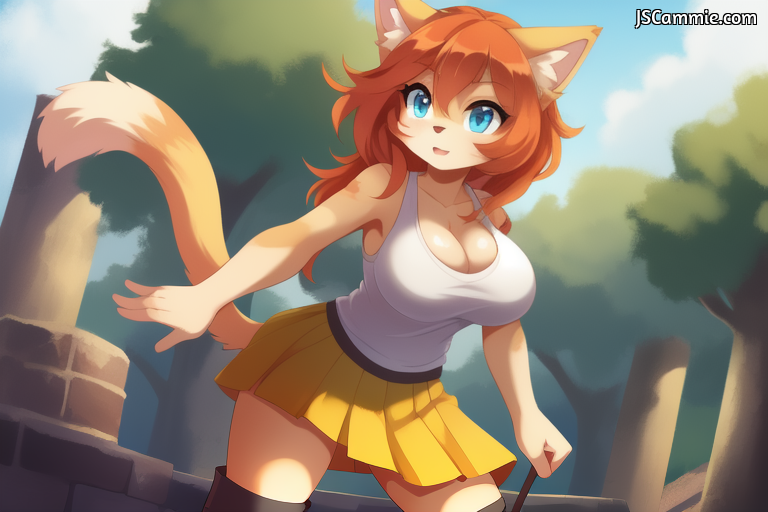 Prompt: Female cat, solo, female focus, Breed: Tabby Cat, busty, cleavage, Tan fur, Blue eyes, white shirt, yellow tanktop, yellow skirt, tail, long red hair, black leggings, white boots, Shin Guards, standing up.