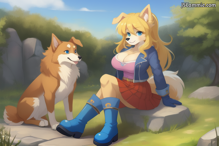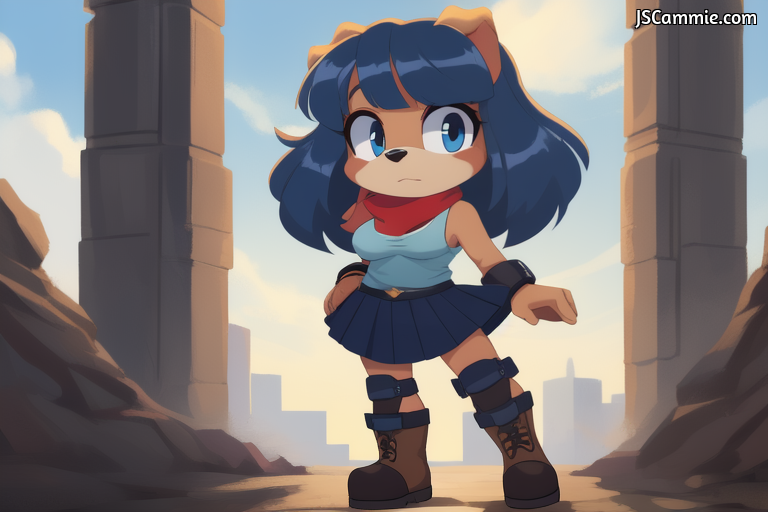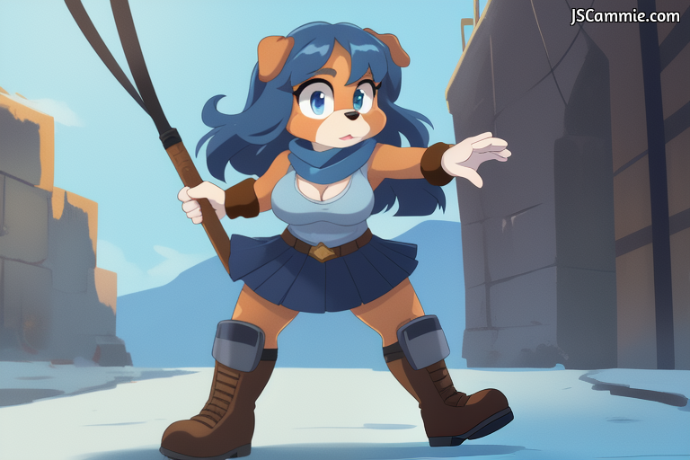 Prompt: Female dog, solo, Female Focus, Breed: English Cocker Spaniel, busty, cleavage, blue eyes, red eye shadow, Long Blue hair, brown fur, Navy-Blue scarf, Light Blue Tank top, Black arm sleeves, Navy-Blue Skirt, Black Leggings, straps, Tan boots, Shin Guard, standing up.