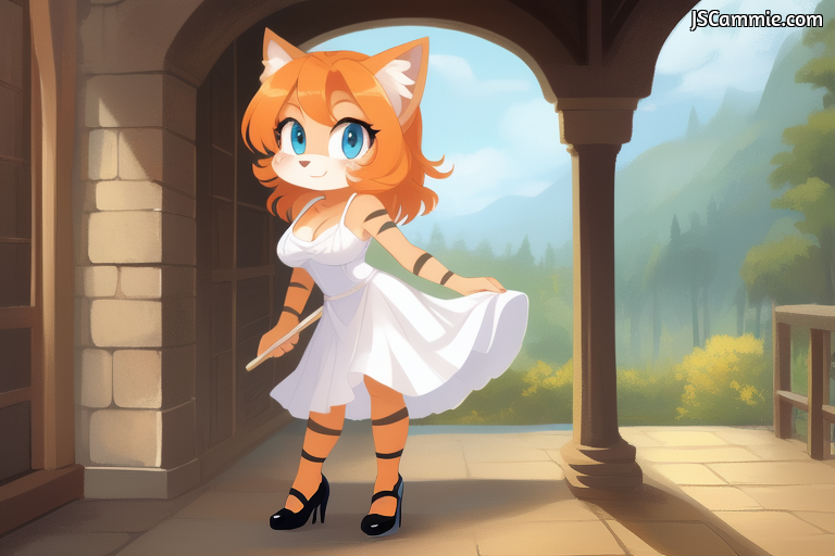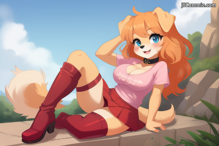 Prompt: Female Dog, Solo, Female Focus, Breed: Golden Retriever, busty, cleavage, Sky Blue eyes, blue eye shadow, Long Orange hair, Tan fur, Pink T-Shirt, black collar, Red Skirt, Pink Stockings, red Boots, standing up.