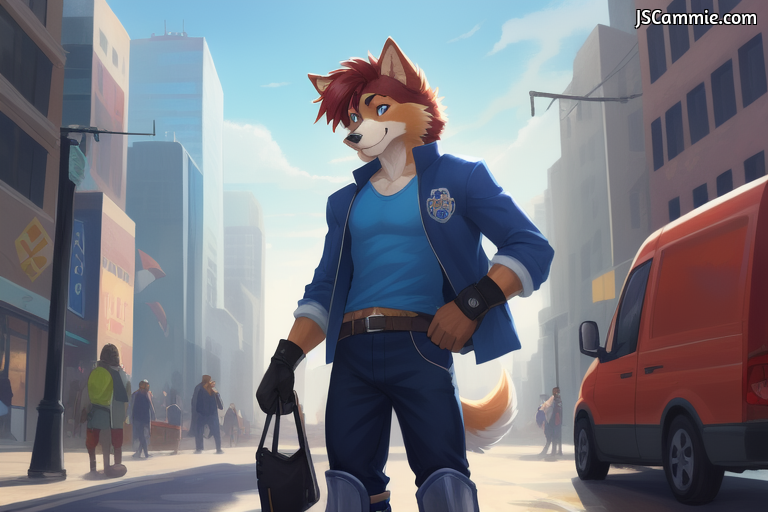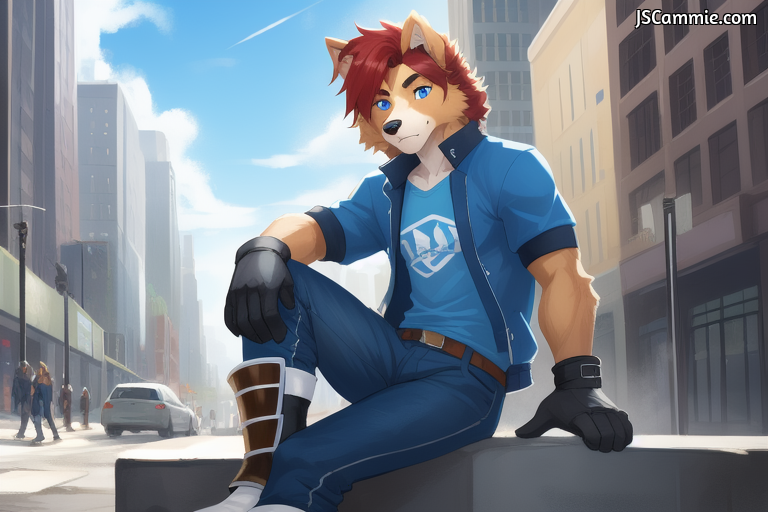 Prompt: Male dog, solo, male focus, Breed: rough collie, Ribbed abs, blue eyes, Short Red Hair, Blue and white Jacket, Blue T-Shirt, Blue pants, Black Gloves, White boots, Shin Guards, Van, city background, daytime.