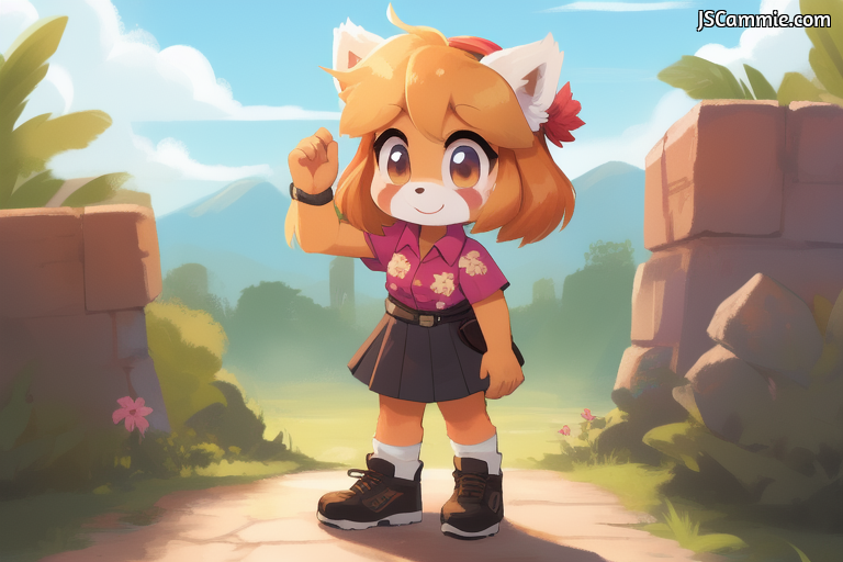 Prompt: Isabelle, Red Panda, Solo, Female Focus, young child, red hair, techwear, pink Hawaiian shirt, White skirt, brown shoes, standing up.